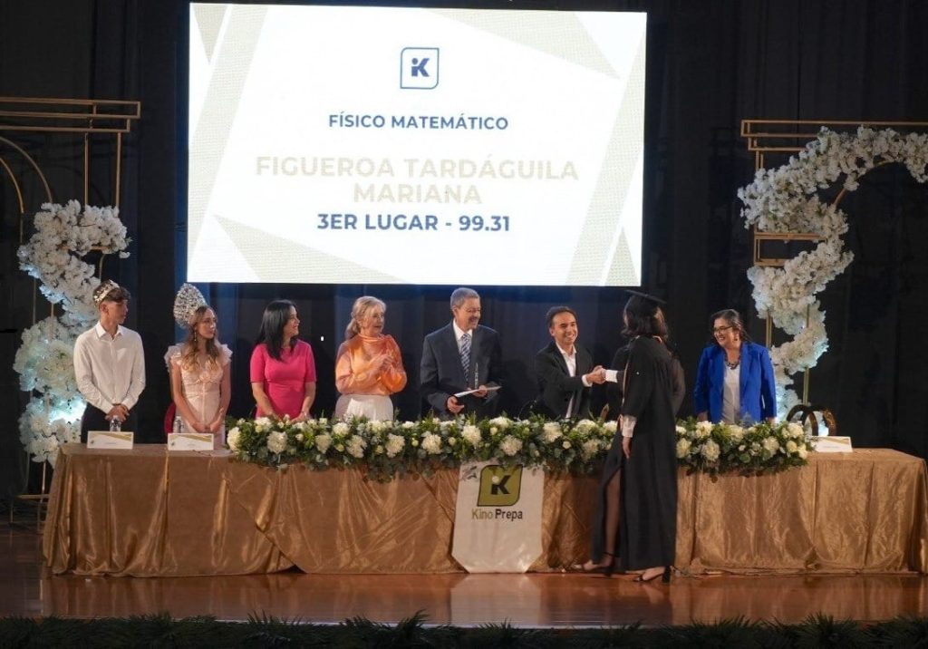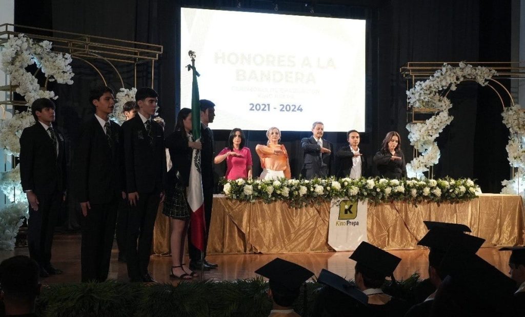 La graduación fue presidida por el director general del Instituto Kino, padre José Luis del Río Gallegos, el delegado de la SEC en esta ciudad, Miguel Ángel Soto Montaño, la supervisora de la Zona Escolar 01, Ana Elisa Ortega Cons, los padrinos de generación y docentes Martín Abraham Flores y Oscar Guzmán, y la directora de Secundaria Kino, Rosita Supo Durón.